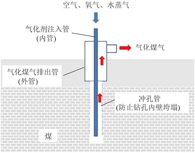 煤炭地下气化是一种新型、绿色、低碳、环保的开采方式,其工艺流程是从地面向煤层钻井,在煤层中构建气化通道,通过注气井向煤层注入气化剂(空气、氧气、水蒸气等)使煤层进行有控制的燃烧,经历煤的氧化、还原等一系列气化反应过程生成气化煤气通过生产井排出地表。煤炭地下气化过程中燃空区的形成及衍化是一个动态过程,是气化通道随着燃烧以及氧化不断膨胀,并伴随大量裂隙的产生及不断扩展垮落的结果。若冒落空间过大,可能引起气化区域上方岩层过度破坏(过量移动、开裂甚至地表沉陷),气化区周边的裂隙也有可能贯通地表或地下水源,从而导致气体泄漏、污染环境等危害并影响地下气化的正常进行。并且,在研究中由于地下气化系统以及实验方式的差异也会导致不同的气化结果,对差异化规律的研究也是研究气化过程中十分重要的课题。同时对气化燃空区的拓展衍化和整个气化过程的能量回收评估,对于实现高效的煤炭地下气化具有十分重要的意义。