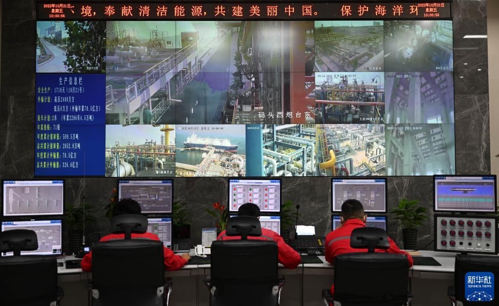 10月21日,工作人员在中国石化天津LNG接收站中控室内监测码头设备运行情况。新华社记者赵子硕摄